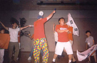 Here we see David Judge in his hotel celebrating Korea's defeat of Portugal (in a poofball tournament).